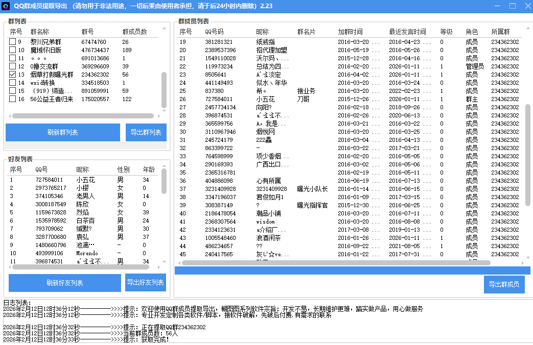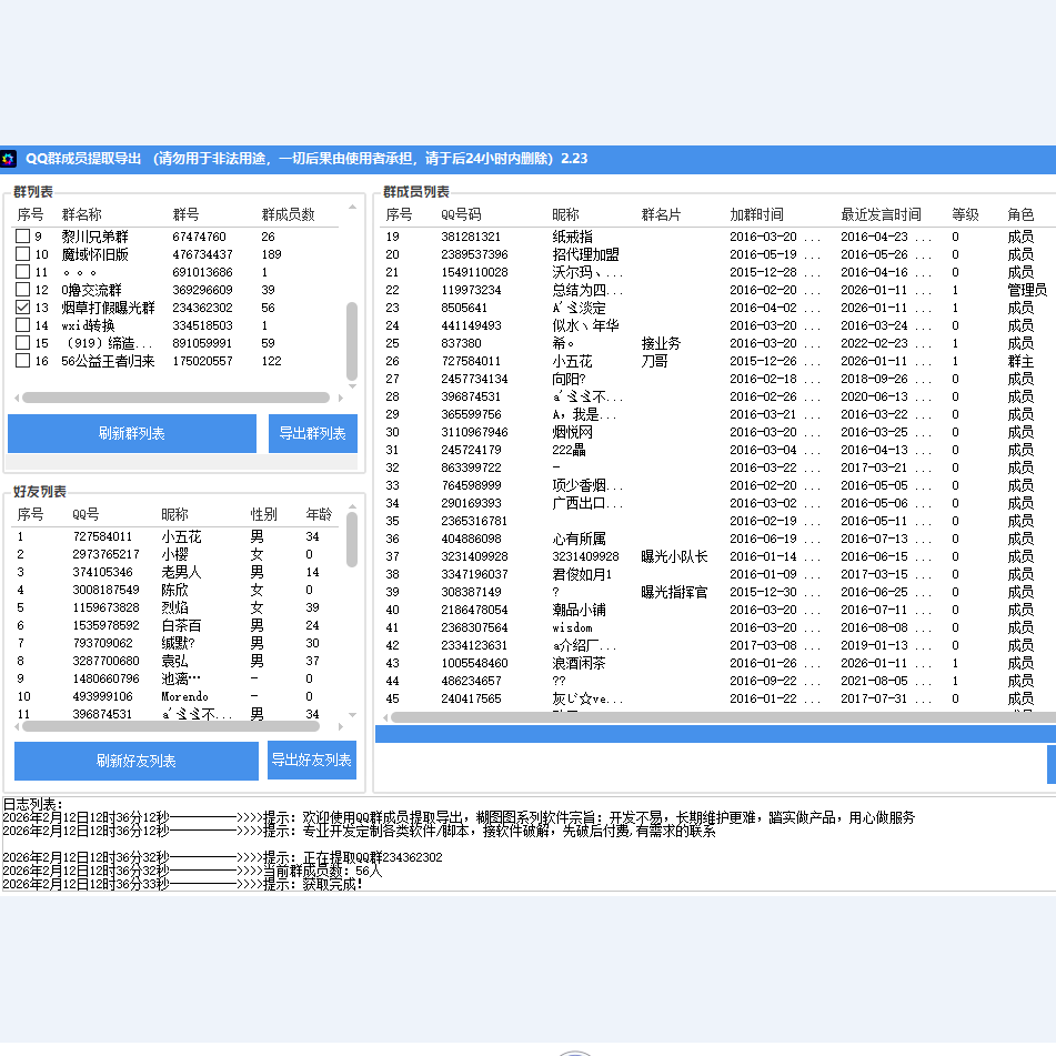 Q群成员提取软件功能:获取自己群或者别人群成员QQ号,导出文档,需要搭配 QQ 怀旧版,最主要的是不封号
