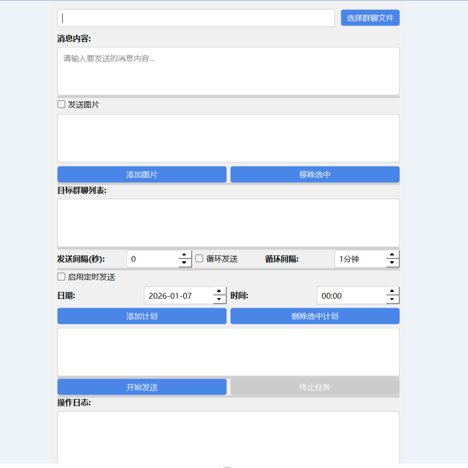 个微定时群发:导入您需要群发的文件 消息,图片 设置好间隔 时间 还支持循环哦