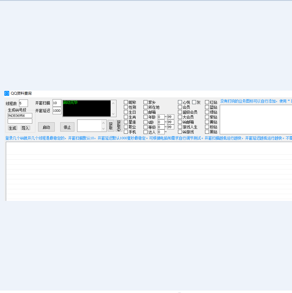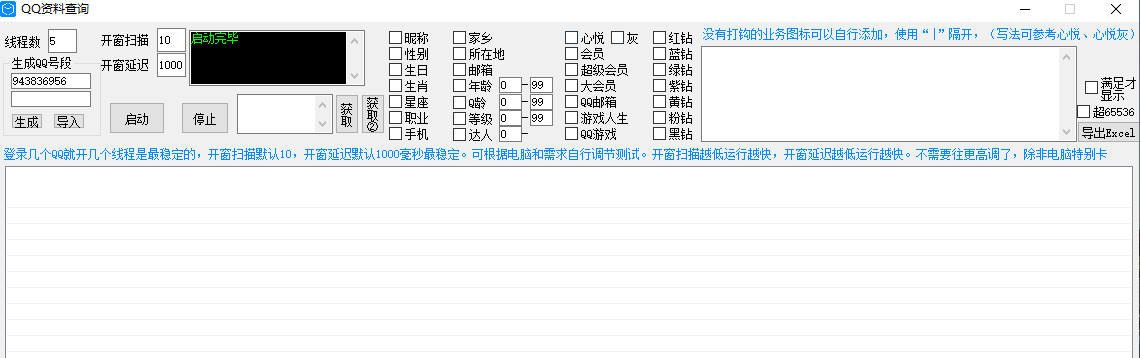 支持多条件筛选,批量处理,效率高,适合需要批量筛选qq达人能量、活跃度、年龄、等级,q龄,心悦会员等资料的朋友